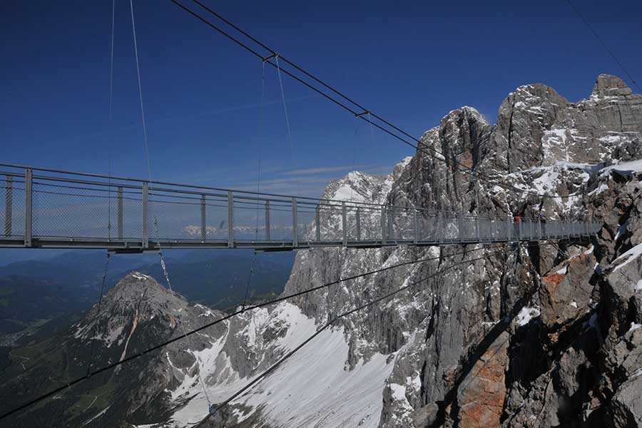Am Dachstein erwartet alle Besucher ein echtes Highlight – 14 schmale Stufen führen hinab auf ein Glaspodest in schwindelerregender Höhe. Wer diese Treppe betritt, steht direkt in der Felswand 400m über dem Wandfuß.
